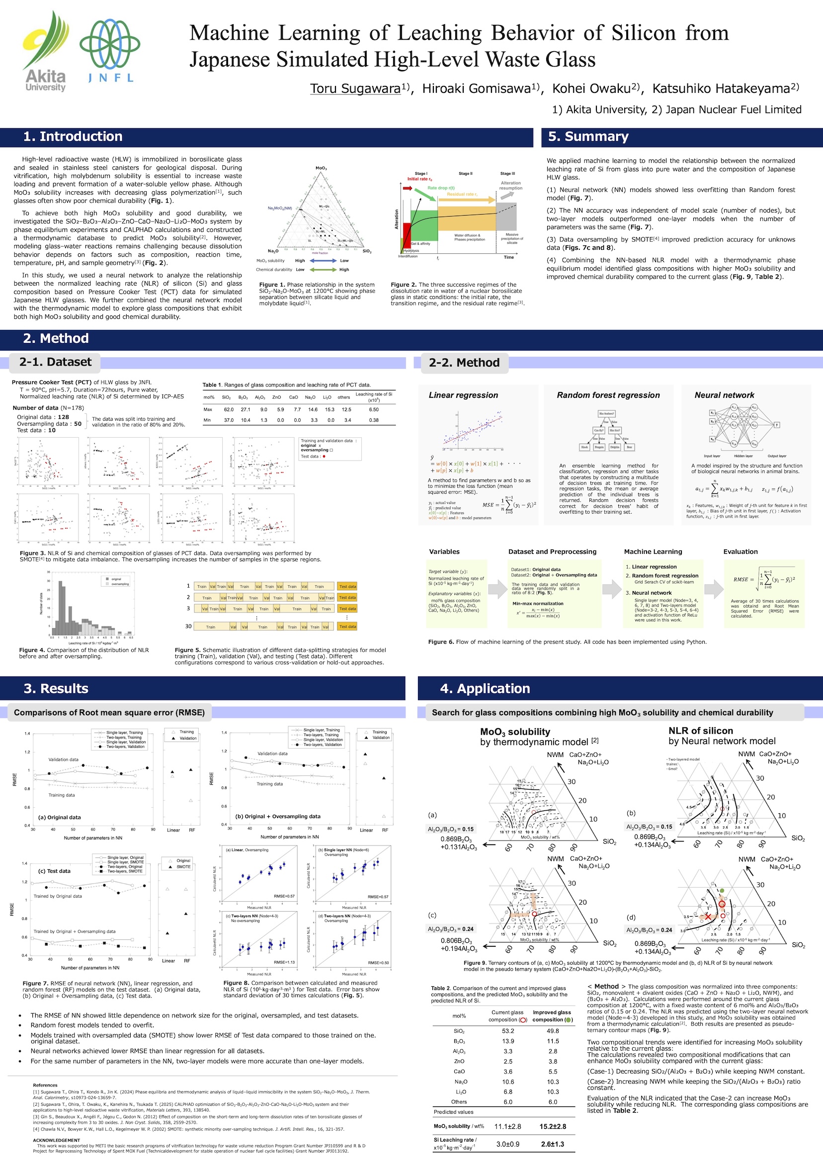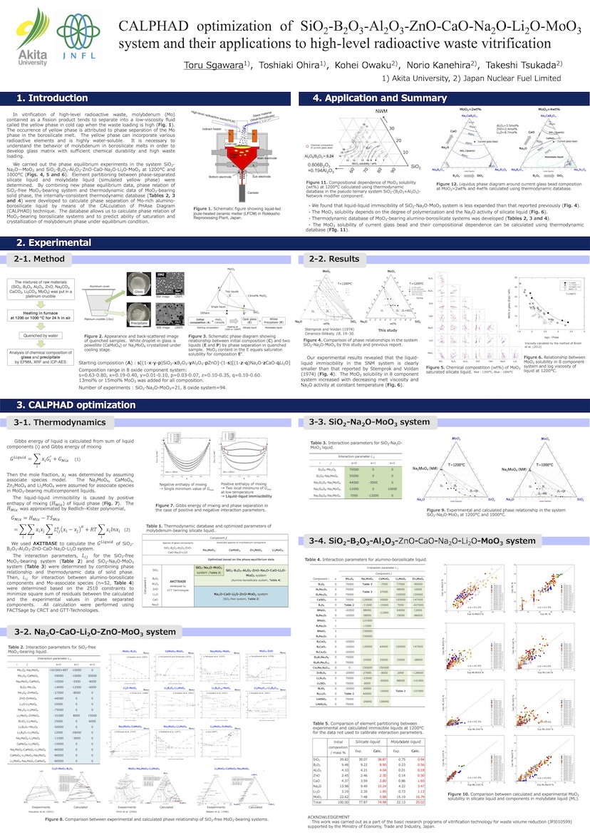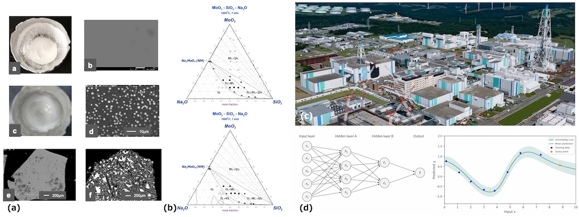 (2)放射性廃棄物の地層処分AI・データセンターによる電力需要増や、エネルギー安全保障の強化、脱炭素化を背景に、各国で安定供給が可能でCO₂を排出しない原子力発電を再評価する動きが広がっています。一方で、原子力発電は使用済み燃料を如何にして安全に処分するのかが課題となってきました。当研究室ではその解決に向けて、室内実験と熱力学計算、機械学習を組み合わせた解析を行い、放射性廃棄物のガラス固化体の形成メカニズムや地下水との反応性に関する地球化学的研究などを行っています(日本原燃株式会社との共同研究・受託研究)。 |