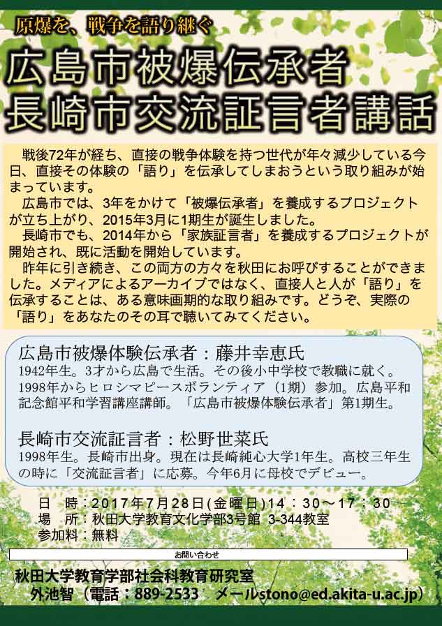 研究室では「広島市被爆伝承者 長崎市交流証言者講話」を7/28(金)14:30〜17:30で実施します。詳細はこちら(ちらし)から。外部からの参加も歓迎です。