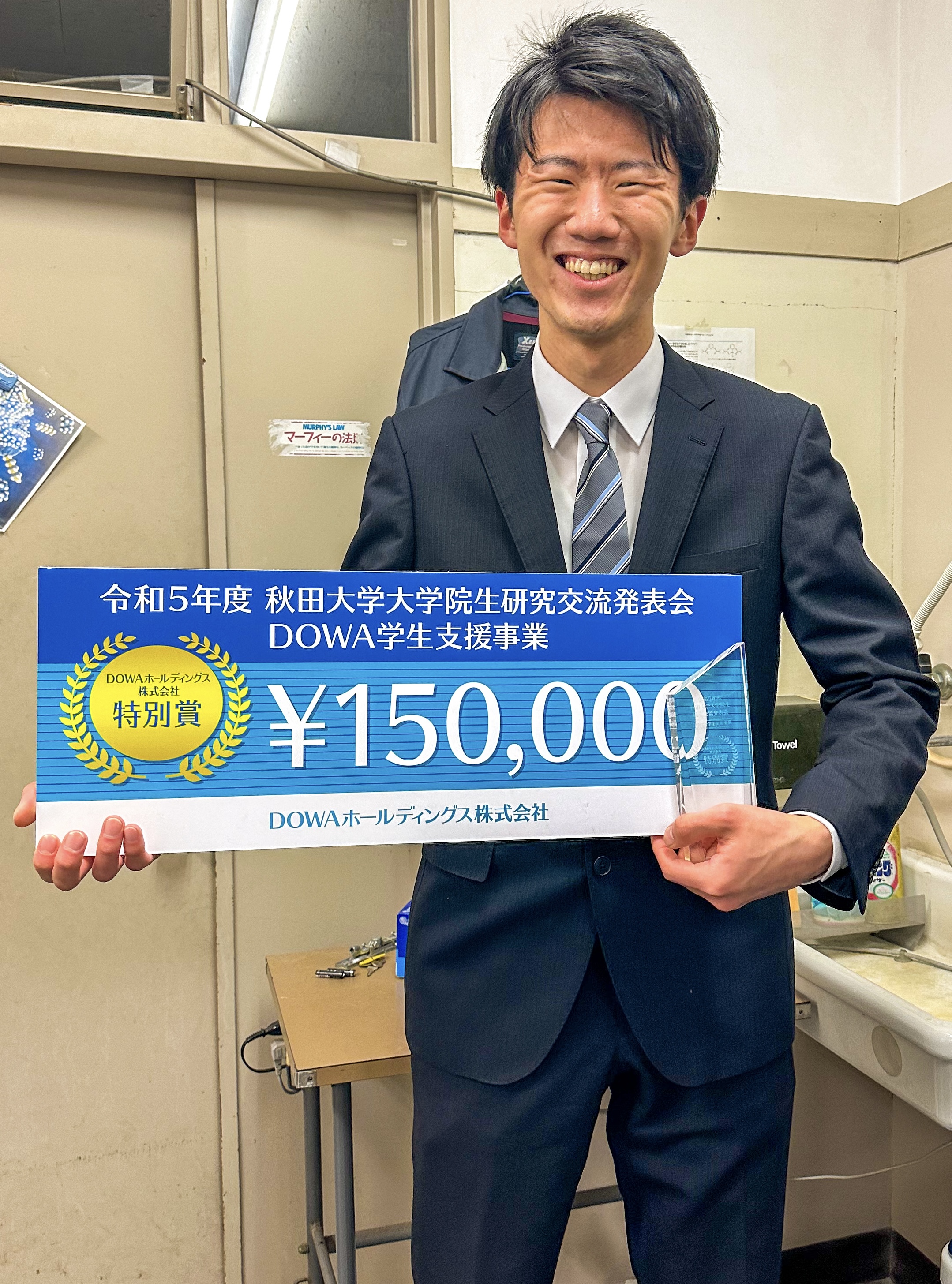 M1の岡田君が令和5年度秋田大学大学院生研究交流会~DOWA学生支援事業~で、DOWAホールディングス株式会社「特別賞」を受賞しました。おめでとうございます!