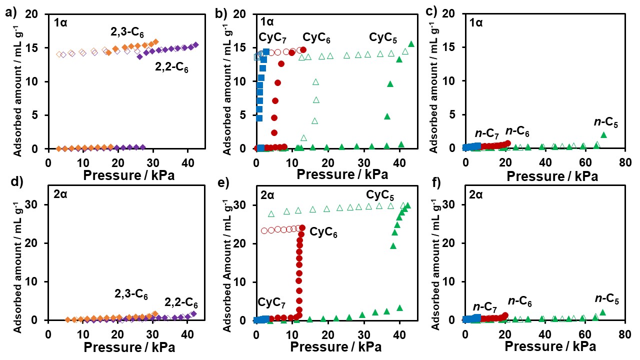 チアカリックスアレーン分子1で構成される結晶は、分岐アルカン(2,2-ジメチルブタン(2,2-C6)や2,3-ジメチルブタン(2,3-C6))や環状アルカン(シクロペンタン(CyC5)やシクロヘキサン(CyC6)、シクロへプタン(CyC7))の蒸気を効果的に取り込むことがわかりました。一方、分子2で構成される結晶は、環状アルカン(CyC5とCyC6)を選択的に認識して、蒸気を選択的に取り込みます。