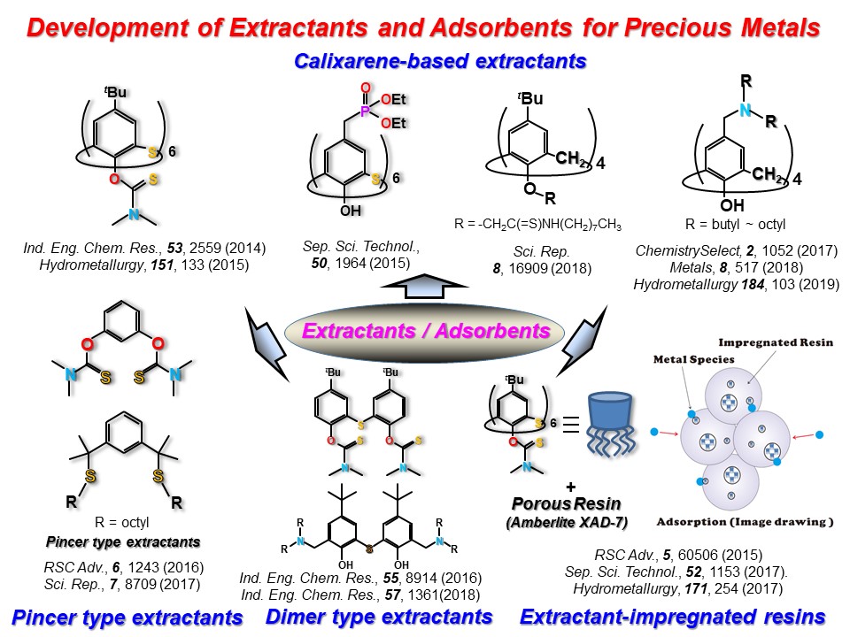 当研究室では、自動車排ガス浄化触媒由来の酸浸出液を対象とし、上述の課題を解決できるPGM抽出剤、特にPd(II)とPt(IV)に焦点を当て、開発を行っています。これまでに、大環状化合物であるカリックスアレーンを基本構造とする抽出剤をはじめ、ベンゼン環1枚を基本構造とするPincer(ピンサー)型抽出剤の開発に成功しています。